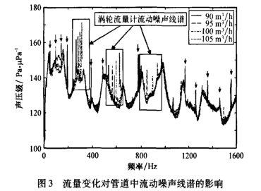 圖3是不同流量情況下,測量位置測得水聲信號的頻譜,圖3中向下箭頭所對應的線謂頻率在管道流量改變過程中沒有發生改變,只是線譜峰值發生了微小改變,由于離心泵的葉輪轉速在流量改變過程中保持不變,這些線譜應該對應著離心泵的流動噪聲。圖3中方框內線譜則隨流量改變發生了明顯變化,這是因為流量改變導致渦輪流量計的渦輪轉速發生了變化。圖3中3個方框內的線譜分別對應渦輪流量計所產生流動噪聲的基頻及其倍頻,以300Hz.600Hz及900Hz左右為頻率中心。