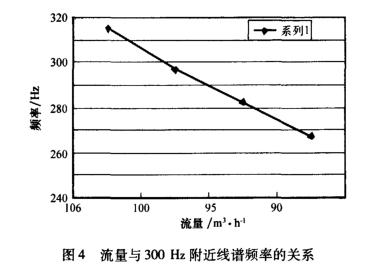 選擇300Hz頻率對應的方框,研究方框內各線譜頻率與流量的對應關系,從圖3可看出,流量改變與300Hz附近線譜頻率變化基本成正比關系,由于渦輪流量計流動噪聲的線譜頻率與式(1)中的電脈沖頻率成正比,流量與頻率之間的關系對應式(1)的描述。