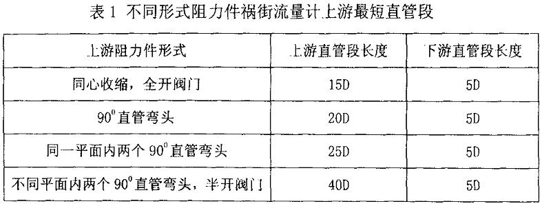 由于渦街流量計是利用流體自身的規(guī)則振蕩來計量流量的,因而對流體的速度分向及流動噪聲,比較敏感,因此在應用過程中對管道安裝狀況要求較高。對L游不同形式的阻力件必須配置足夠長的滿足不同要求的直管段,以保證儀表的測量精度。表l給出了不同形式阻力件禍街流量計上游最短直管段。