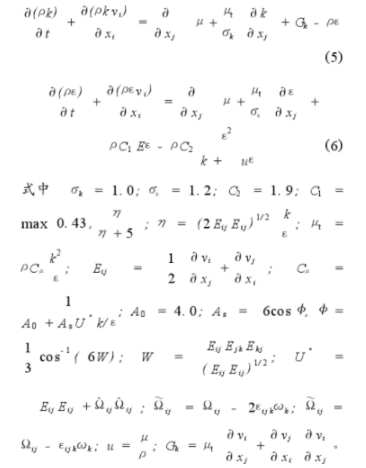 Realizablek-ε湍流模型為目前工程上使用最為廣泛的湍流模型之一。渦輪流量計采用的各種流動包括旋轉(zhuǎn)均勻剪切流、包含有射流和混合流的自由流動管道內(nèi)流動邊界層流動和帶有分離的流動等。它是兩方程模型,需要求解的變量為湍動能k與湍動能耗散率ε,它們所滿足的輸運方程為