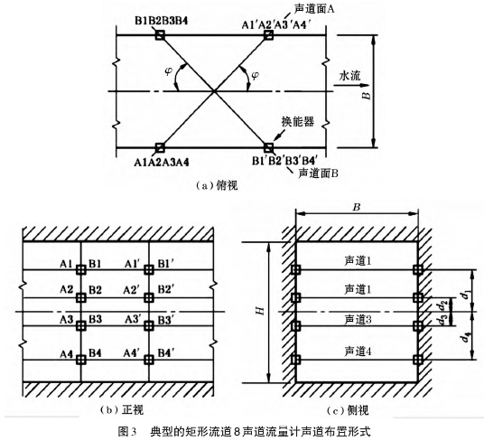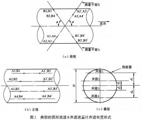 超聲波流量計是在上述原理的基礎上,在流道內(nèi)按照--定的規(guī)則設置多條聲道,將各條聲道測得的流道軸向線平均流速采用相應的積分方法進行積分計算,從而得到流道內(nèi)流體的總流量。這種時差式超聲波流量計方案,能夠利用常年“暢流期”條件,有利于泵站水量計算,避免了人為選擇推流計算參數(shù)而引起較大誤差的問題。