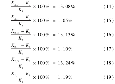 對2#電磁流量計在聚合物溶液中得到的儀器常數,與電磁流量計在自來水中得到的儀器常數進行對比分析。首先計算分析2#電磁流量計在3種不同黏度/濃度的聚合物溶液中得到的儀器常數K7、K8、K9,3個儀器常數相互之間差別很小,因此判斷2#電磁流量計響應規(guī)律受聚合物溶液濃度和黏度的影響很小,可以忽略不計。然后分別對2#電磁流量計在3種不同黏度/濃度的聚合物溶液中得到的儀器常數K7、K8、K9與2#電磁流量計在自來水中得到的包括層流和紊流兩種流態(tài)的儀器常數K2.3進行對比計算、與2#電磁流量計在自來水中得到的層流流態(tài)的儀器常數K2.1進行對比計算,得